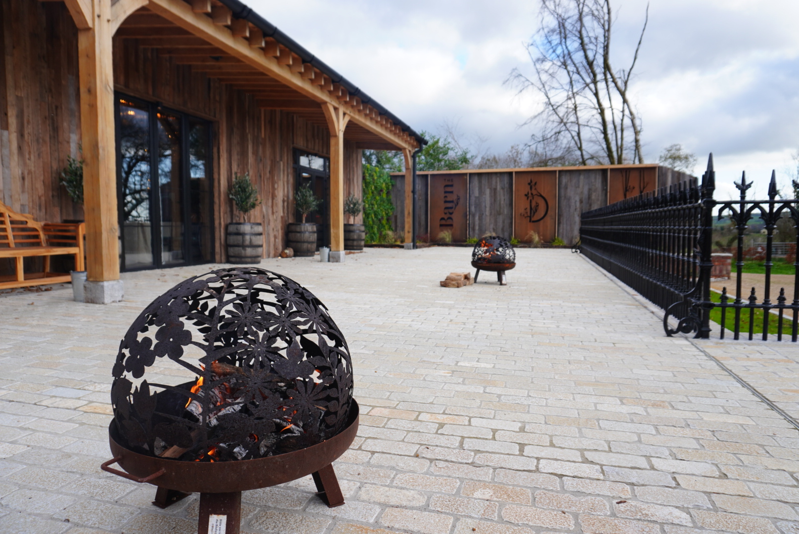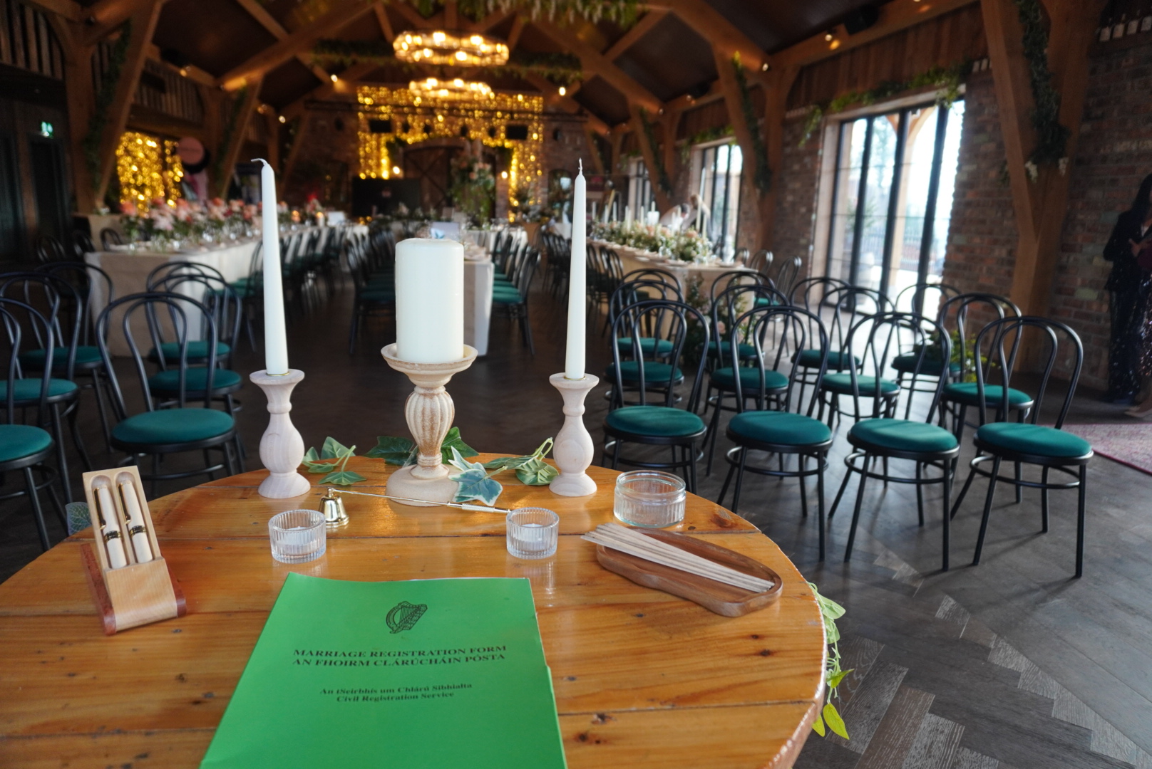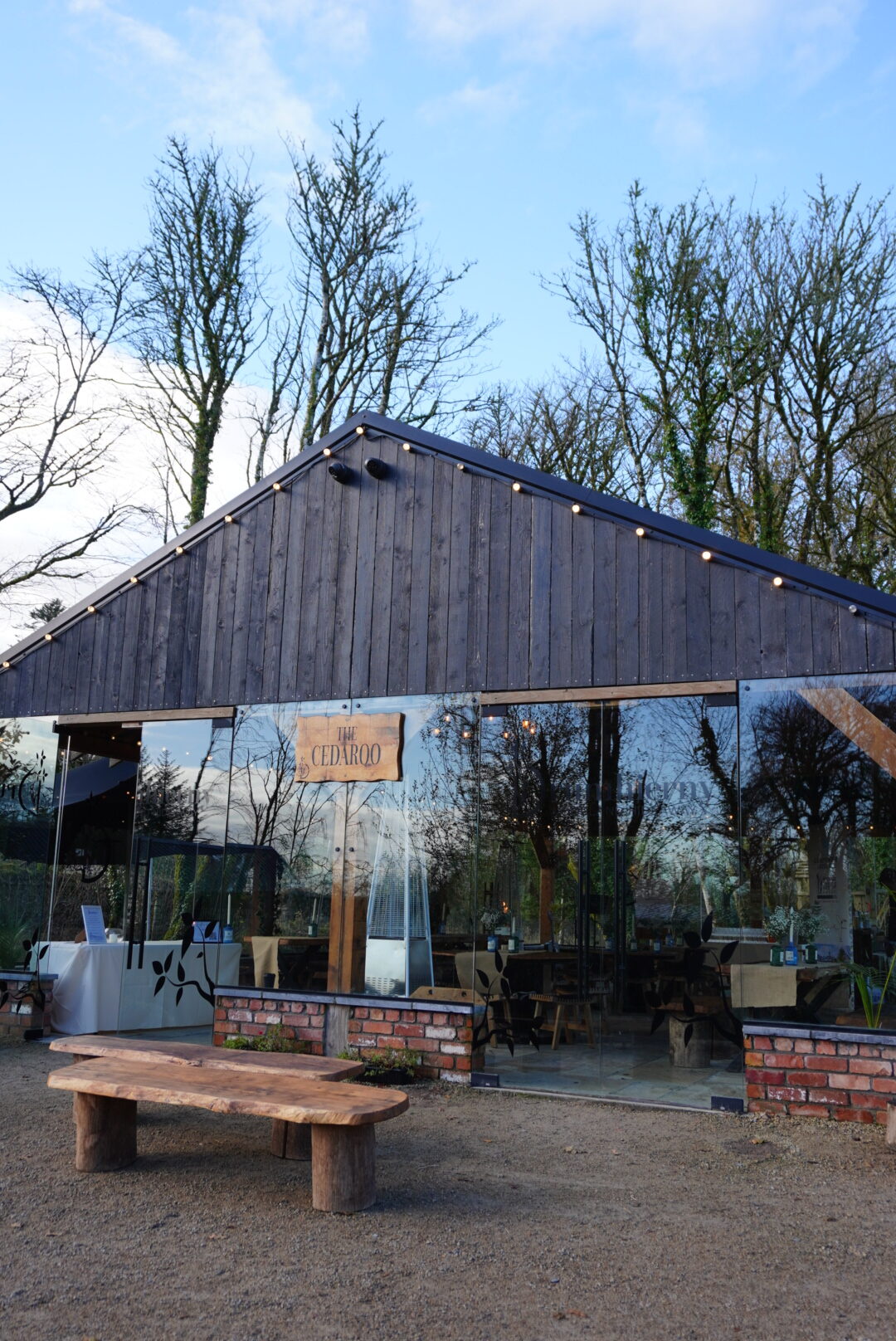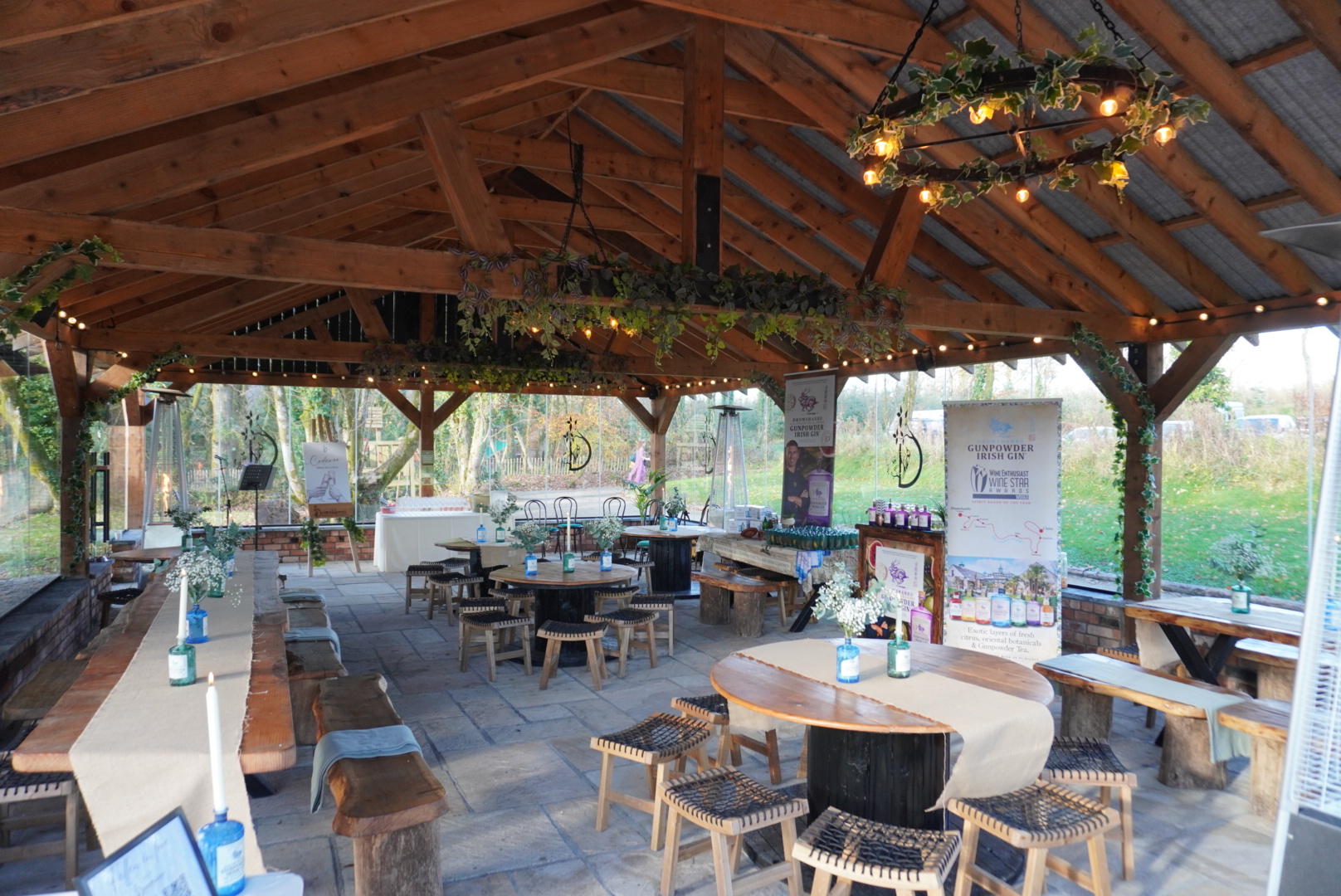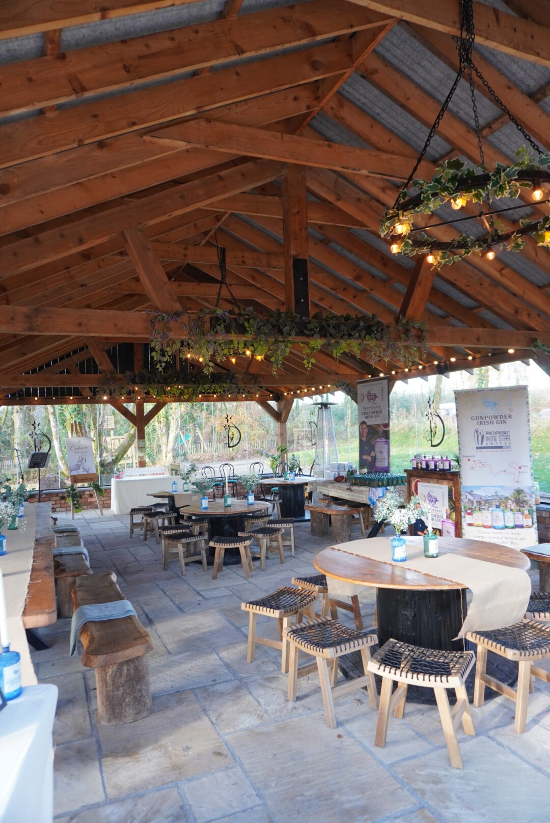 On arrival, guests are welcomed into The Cedaroo which is named after the signature cedarwood used throughout the venue. There’s a beautiful outdoor area with firepits, perfect for music, drinks, and that “kick off your shoes and settle in” vibe. When I visited, The Shed Distillery, home of Drumshanbo Gunpowder Gin was doing the drinks reception. It’s produced right up the road so this was a lovely local touch.