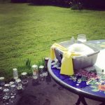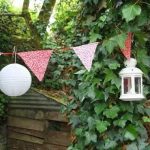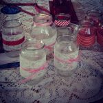 When we were clearing out the sheds, i found a load of old jam jars which you you pay a small fortune for today. I scrubbed them and turned them in to candle holders for the yard during the night. The jars were covered in lace and material matching the bunting.