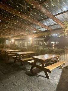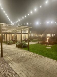 When dinner is ready, guests return to the transformed barn. The private bar, which blends seamlessly with the space, keeps everyone close to the dance floor, creating a lively, intimate vibe. Outside, the secluded courtyard is exclusively yours, and with festoon lighting, fire pits, and cozy seating, the atmosphere at night is truly enchanting.