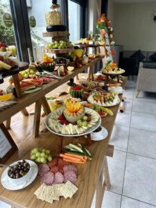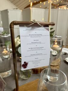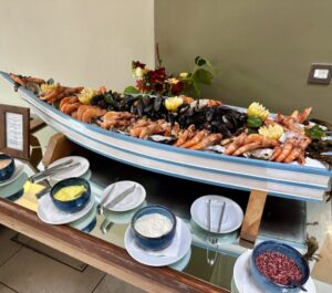 Before dinner, guests gather in a private reception area, greeted by a seafood boat, a charcuterie table, and essentials like gin, cocktails, beer, and prosecco. This spread is part of every package, and the look of awe on guests’ faces says it all. AND there is a Trad Band included too!
